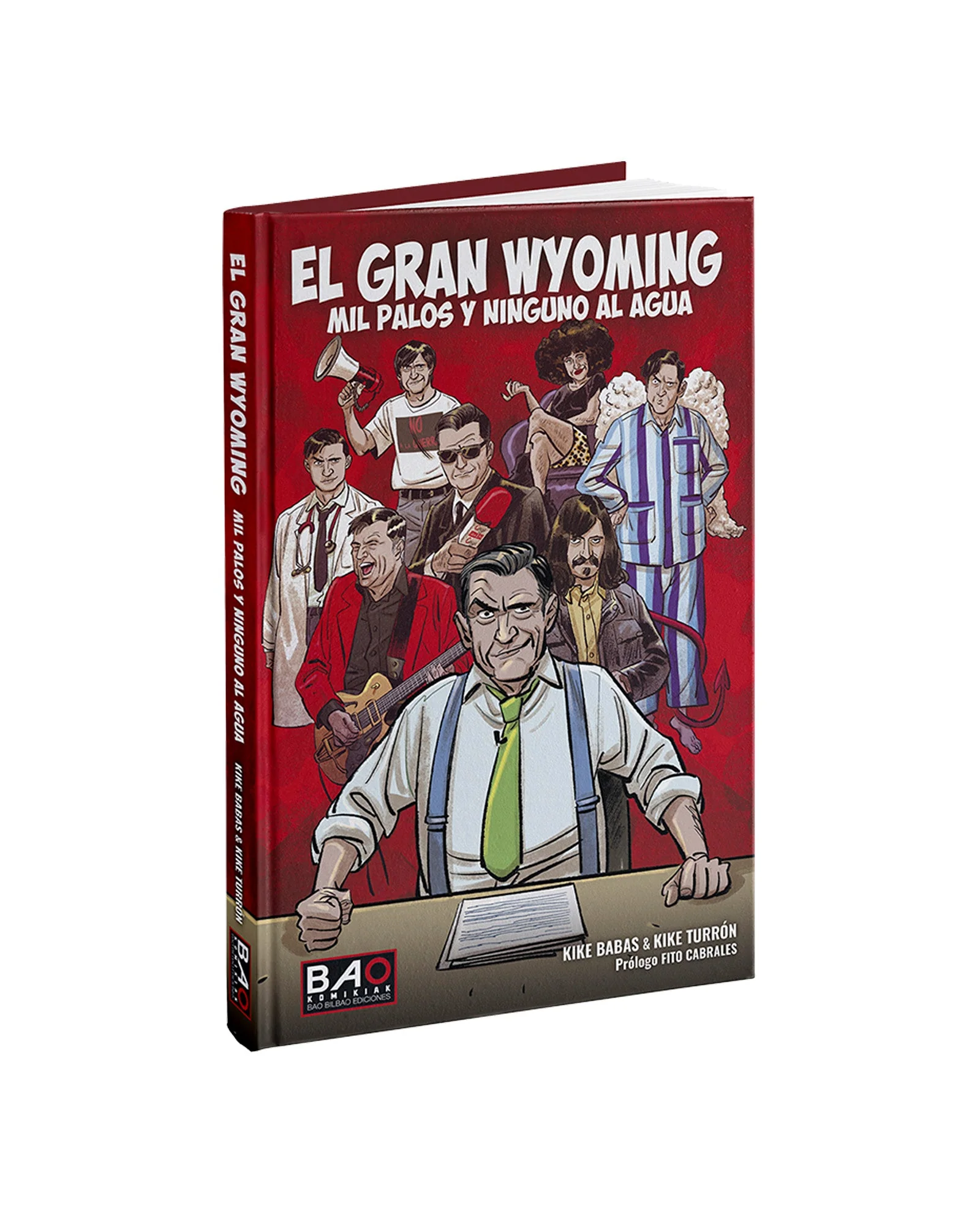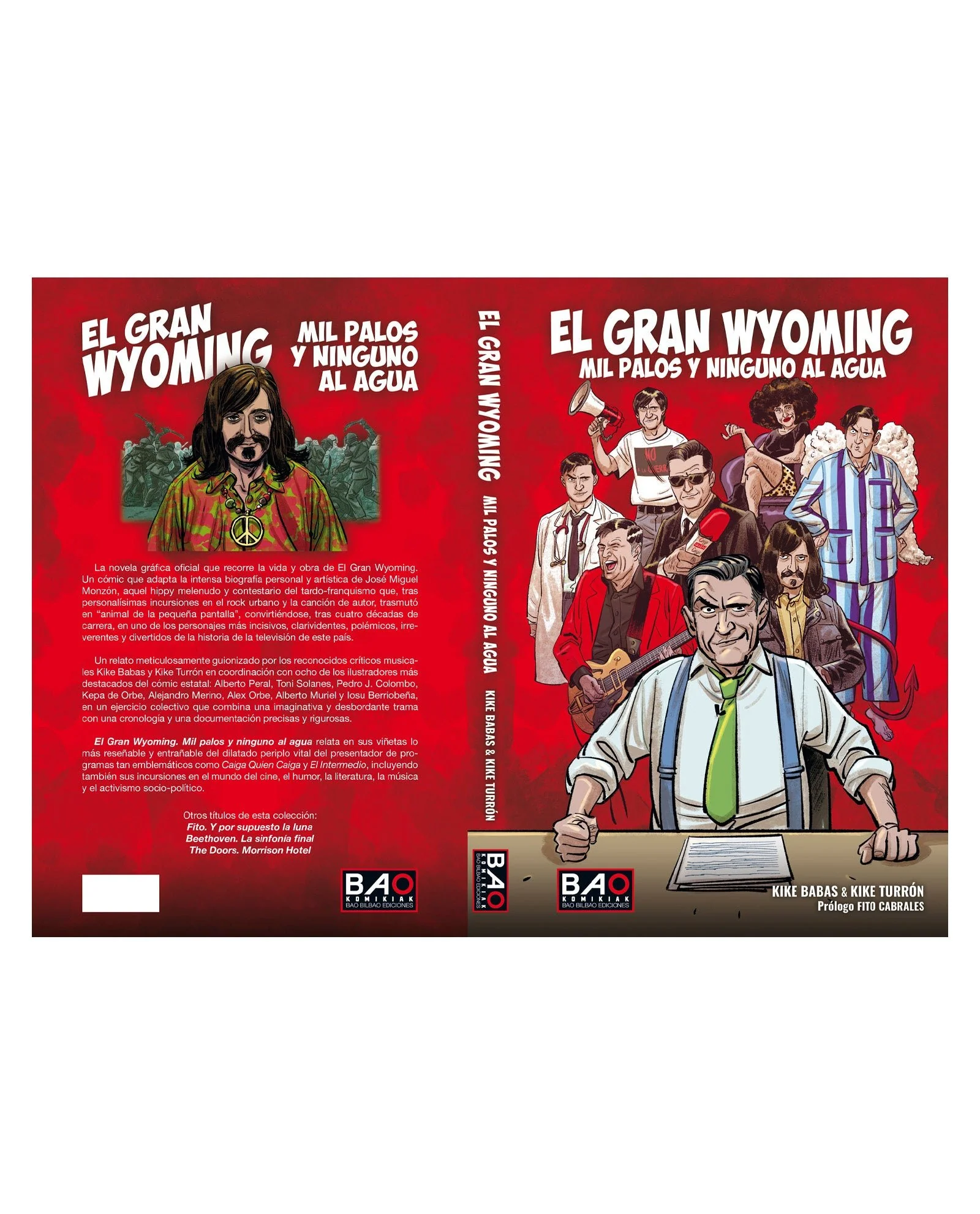 El Gran Wyoming. Mil palos y ninguno al agua es un relato meticulosamente guionizado por los reconocidos críticos musicales Kike Babas y Kike Turrón (cuya bibliografía incluye obras sobre Leño, Rosendo, Manu Chao, Fito, Los Rodríguez, Siniestro Total, etc.) en coordinación con diez de los ilustradores más reseñables del cómic estatal.