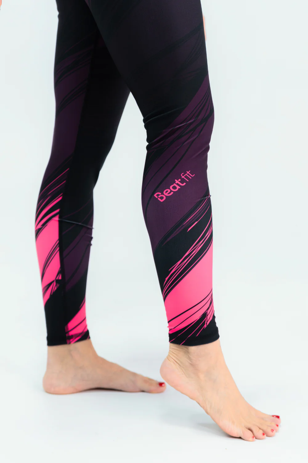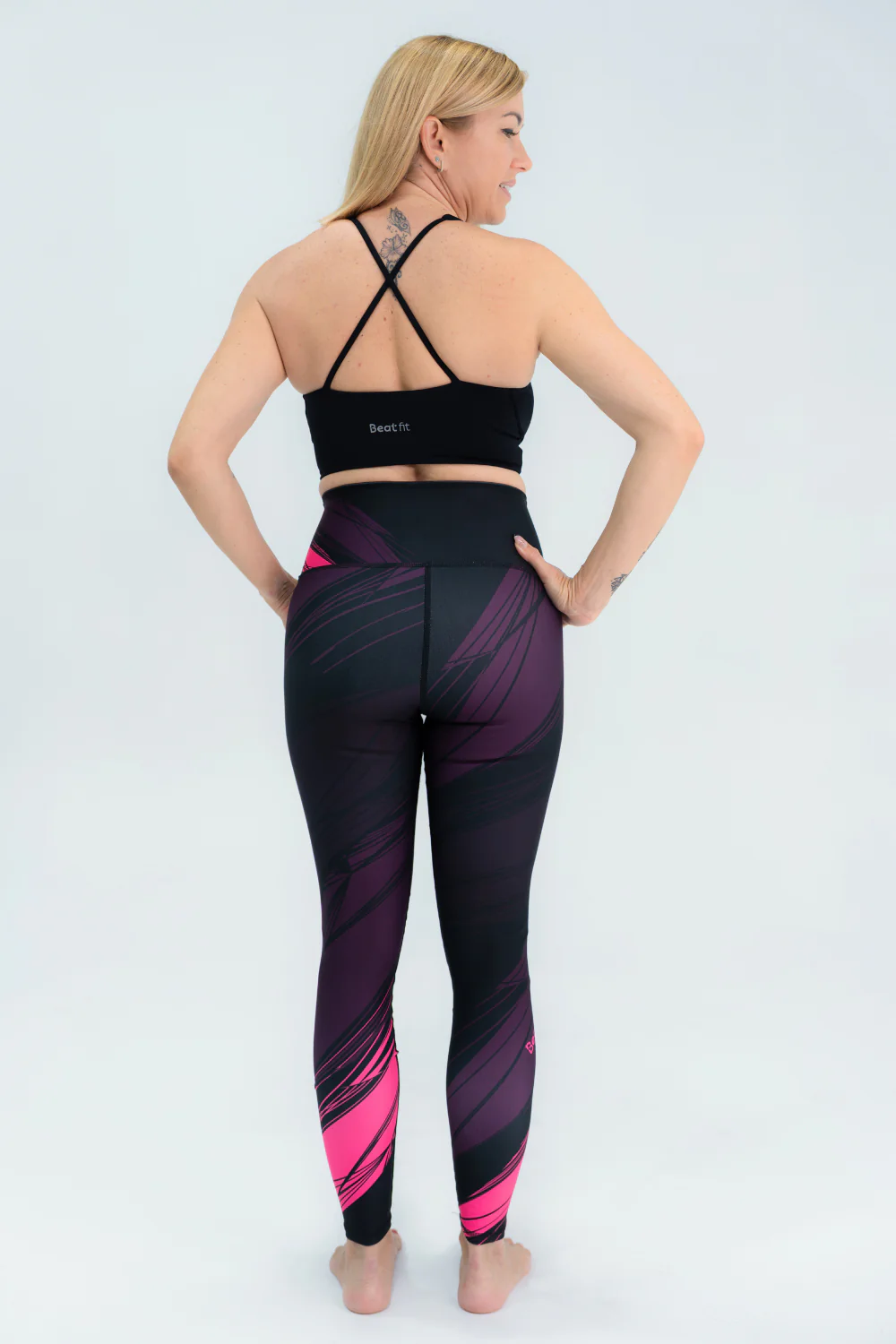 El Legging Vortex combina fuerza y movimiento en un diseño que atrae todas las miradas. Su base oscura profunda se fusiona con destellos violeta y fucsia que simbolizan poder, feminidad y transformación.